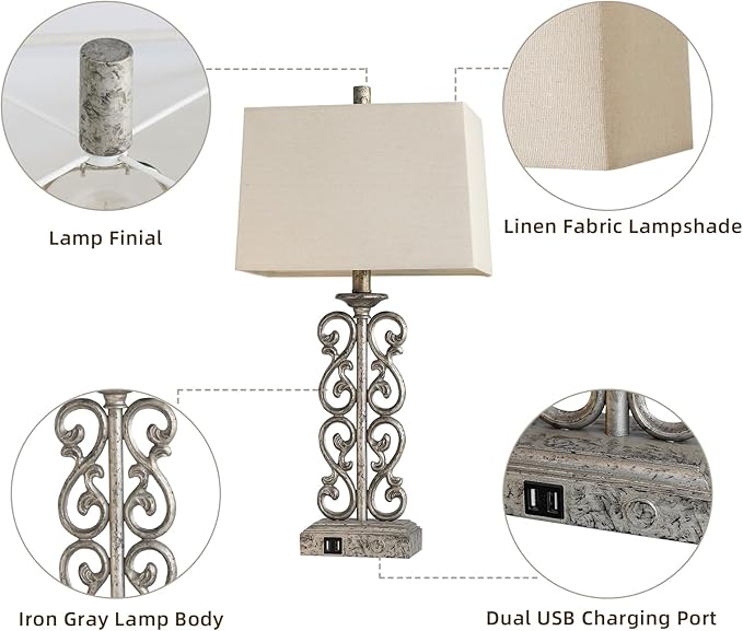 25" Set of 2 Farmhouse Touch Resin Table Lamps with 2 USB Ports, 3-Way Dimmable Rustic Vintage Nightstand Industrial Table Lamp for Bedroom Living Room Dorm, 2 Bulbs Included