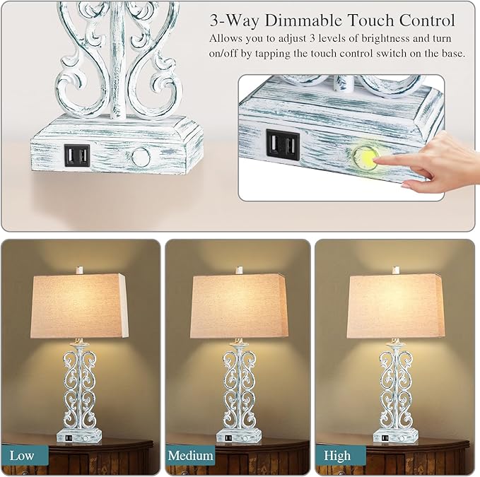 25" Coastal Set of 2 Touch Resin Table Lamps for Living Room with 3-Way Dimmable Dual USB Ports, Rustic Farmhouse Lamps for Bedside Bedroom, Nightstand Home Decor, 2 Bulbs Included