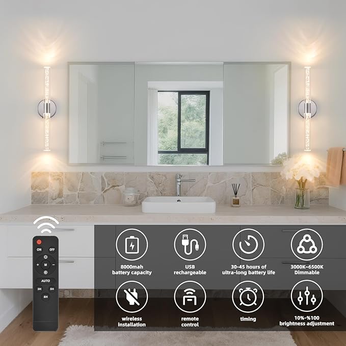 - Remote control & timer: This rechargeable wall sconces set of 2 comes with a remote control and a push switch that makes it easy to change the color of the light by pressing the push-button switch on the base or the dimmer switch on the remote control. This bathroom sconces set of 2 with a timer function,Allows you to set the light to turn off automatically after 3, 5, 8 hours, helps you save power.
