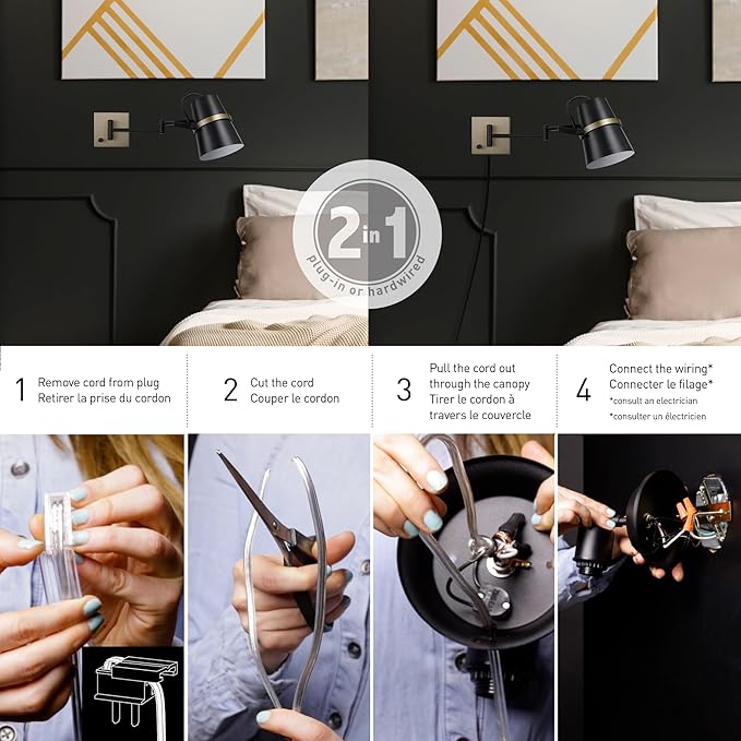 - PLUG-IN OR HARDWIRE CAPABILITY: the innovative 2-in-1 design allows you to install your wall light as a plug-in so you can place it anywhere in your home or use the hardwire option to create a sleek cordless look