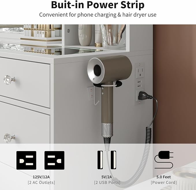 - Come with Power Outlet: Vanity desk comes with a hair dryer stand and power outlet; The charging station includes 2 standard plug sockets and 2 USB ports, easy to connect your hair dryer, curling iron, computer, cell phone, ipad and other devices, so that all activities can be carried out on this vanity table