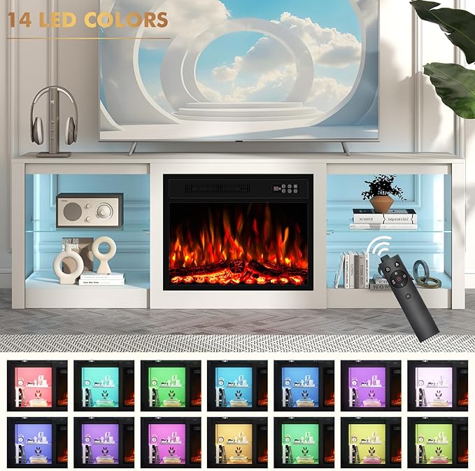 Ludatido 70 Inch Fireplace TV Stand with 23" Fireplace Insert, Entertainment Center with 14-Color LED Lights, Open Storage, Adjustable Glass Shelves, White TV Stand for Living Room Fits up to 80" TVs