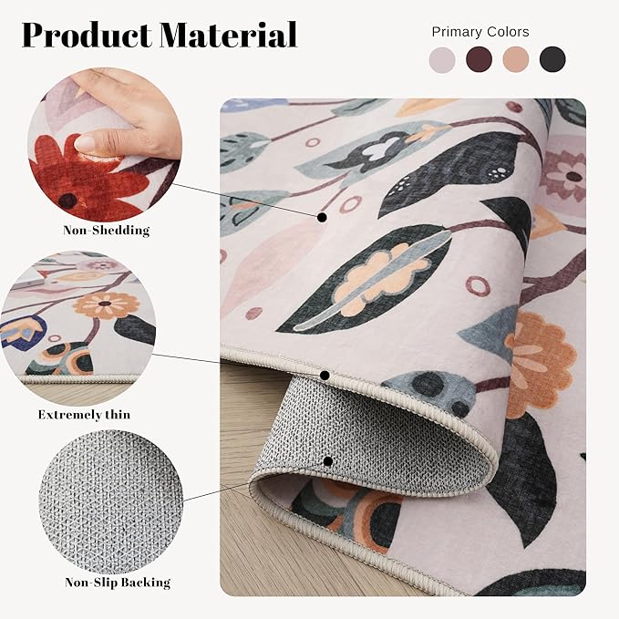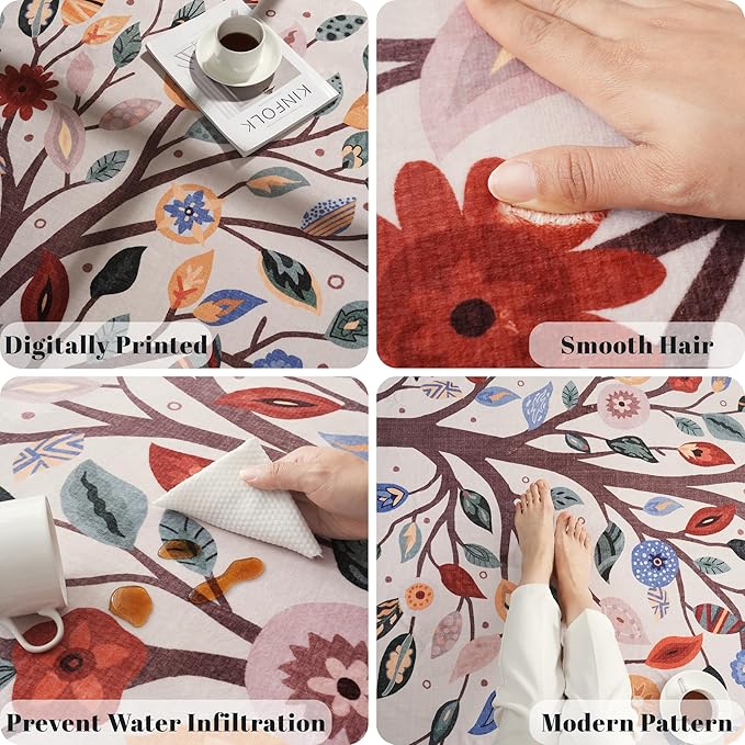 Area Rug 4x6 Rug Washable Bohemian Rugs Non Slip Low Pile Floral Tree Small Carpet for Bedroom, Bedside, Kids Room, Office, Dining Room, Beige