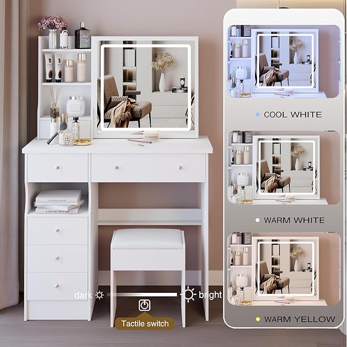 - Touch-Activated Mirror with Adjustable Lighting: This make up vanity with touch mirror features a responsive touch switch that lets you cycle between white, natural, and warm light. Long press to adjust brightness, creating the ideal lighting for flawless makeup every time—perfect for your morning routine or a night out.