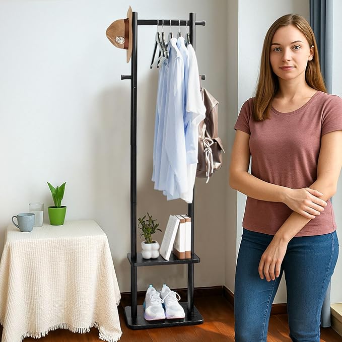 Coat Rack,Freestanding Hall Tree for Entryway Home Bedroom Office,Sturdy Wooden Coat Hanger Stand for Clothes Jacket Hats Bags(Black)