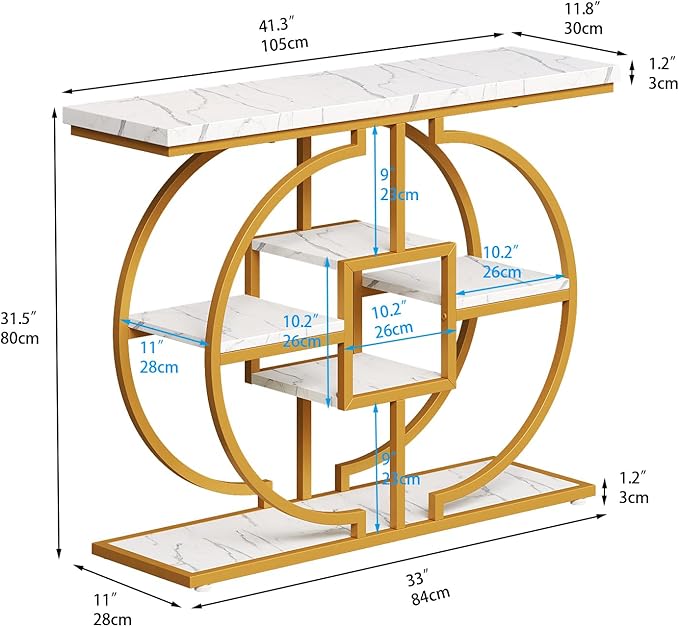 - Solid Construction: The etagere console table is constructed of a rustic laminate top with a scratch and stain-resistant finish, which allows for easy cleaning. Its frame is crafted from powder-coated iron, giving it a striking geometric silhouette suited for any fashionable room. It also features 4 non-slip adjustable feet on the bottom of the legs to keep the table balanced and protect your floor from scratches
