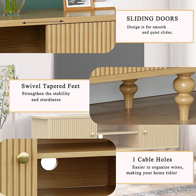 Modern Wood TV Stand for 55 Inch TV, Retro Media Console with Storage Cabinets & Shelves, Solid Wood Entertainment Center with Fluted Doors, Mid Century Style TV Cabinet, Nature
