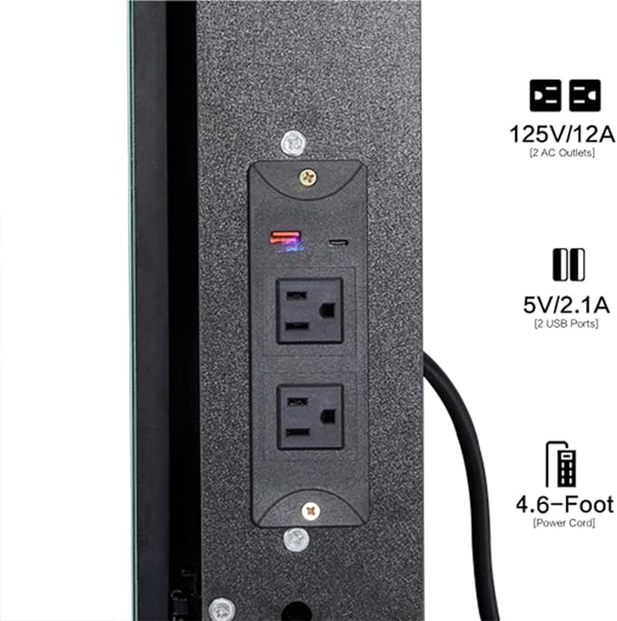 - Built-In Charging & Storage Hub: Designed for modern needs, this black vanity with lighted mirror includes 2 AC outlets, 1 USB, and 1 Type-C charging port—perfect for powering a phone, hairdryer, or tablet. With drawers, shelves, and hidden storage behind the mirror, it’s a true compact vanity with storage.