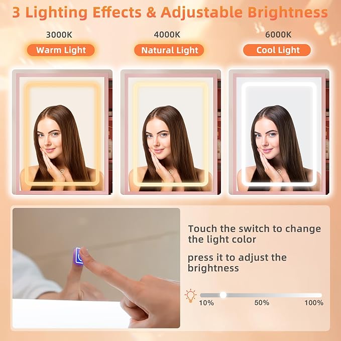 - 3 Color Modes & Adjustable Brightness: The vanity desk with lights offers 3 color modes (warm, cool, and natural) with adjustable brightness, the vanity mirror built-in lights let you create the perfect ambiance for makeup application or skincare routines. Easily change settings with the touch of a button.