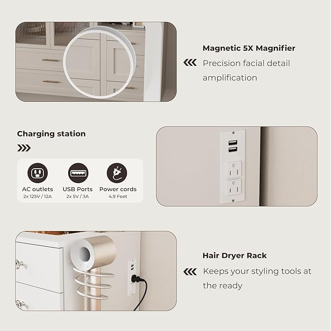 - 【Integrated Convenience Features】This makeup vanity desk with lights integrates modern conveniences. A built-in magnetic 5x magnifying mirror in the top right corner allows for detailed facial inspection, while the built-in charging station powers your devices. A dedicated hairdryer stand keeps styling tools within reach, and the 3-section soft-close drawer slides ensure silent, wobble-free operation—all designed for a premium dressing experience.