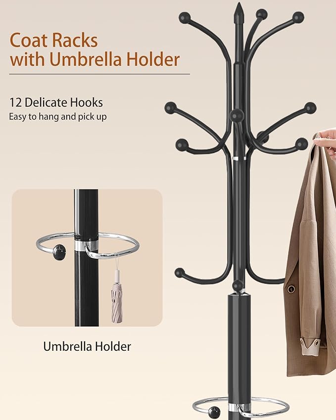 - COAT RACKW WITH UMBRELLA HOLDER: ZIECUKU coat rack is equipped with an exquisite umbrella rack, which can not only place long-handled umbrellas, but also hang folding umbrellas and other daily necessities. Provide you with more storage solutions. It is not only a vertical coat rack, but also can be used as an entrance coat rack, jacket rack stand, hat rack stand, bag rack stand, etc