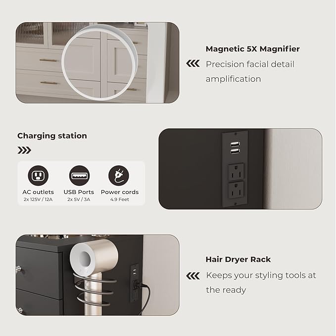 - 【Integrated Convenience Features】This makeup vanity integrates modern conveniences. A built-in magnetic 5x magnifying mirror in the top right corner allows for detailed facial inspection, while the built-in charging station powers your devices. A dedicated hairdryer stand keeps styling tools within reach, and the 3-section soft-close drawer slides ensure silent, wobble-free operation—all designed for a premium dressing experience.