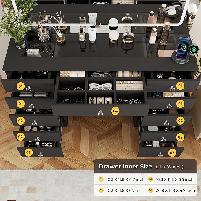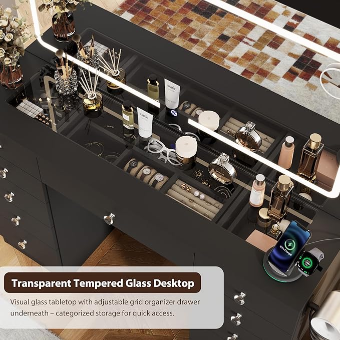 - 【Premium & High-Capacity】This vanity desk features E1-certified panels with scratch-resistant melamine surfaces, offering durability and easy maintenance.It includes 11 smooth-sliding vanity drawers and a spacious 46x12 inches tempered glass top. The adjustable grid-organizer drawers beneath the glass top provide optimal product organization, our vanity desk can keep your area tidy and streamlined.