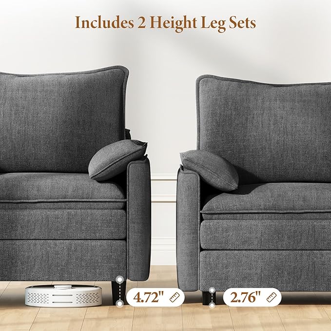 - Two Sets of Sofa Legs & Effortless Assembly: This cloud sectional couch comes with two leg height options—2.76" and 4.72"—so you can customize the height to suit your preference. Choose the lower height for a relaxed look, or the higher height for easier access, which also allows robot vacuums to clean underneath with ease. Assembly is simple: with clear instructions and all the necessary tools included, you can have it setup in just 30 minutes with no extra equipment required