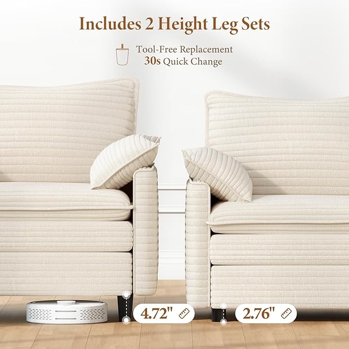 - Two Sets of Sofa Legs & Effortless Assembly: This 4 seater couch comes with two leg height options—2.76" and 4.72"—so you can customize the height to suit your preference. Choose the lower height for a relaxed look, or the higher height for easier access, which also allows robot vacuums to clean underneath with ease. Assembly is simple: with clear instructions and all the necessary tools included, you can have it setup in just 30 minutes with no extra equipment required