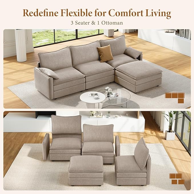 Vesgantti 108" Modular Sectional Sofa, Comfy Cloud Couch with Movable Ottoman Deep Seat Chenille L Shaped Modular Sofa, Sectional Couches for Living Room, Bedroom and Apartment, Light Brown