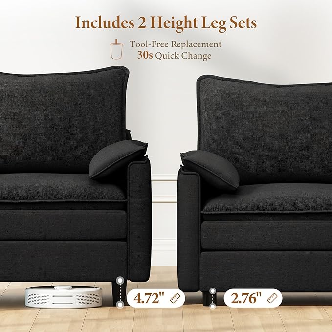 - Two Sets of Sofa Legs & Effortless Assembly: This sectional couch comes with two leg height options—2.76" and 4.72"—so you can customize the height to suit your preference. Choose the lower height for a relaxed look, or the higher height for easier access, which also allows robot vacuums to clean underneath with ease. Assembly is simple: with clear instructions and all the necessary tools included, you can have it setup in just 30 minutes with no extra equipment required