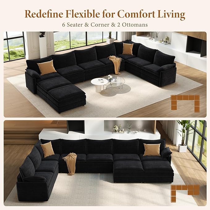Vesgantti Large Modular Sectional Sofa, Big Comfy Cloud Couch with Ottoman Deep Seat Corduroy Cloud Sofa, 9 Seater Large Sectional Couches for Living Room, Bedroom and Apartment, Black