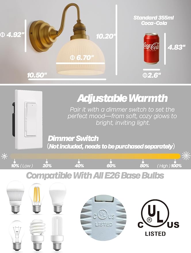 - Versatile Style for Every Space – From Spa-Like Bathrooms to Chic Bedrooms:Gold sconce light damp-rated for worry-free use in bathrooms (ideal over mirrors/vanities), yet elegant enough for living rooms and entryways. The neutral brass-and-white palette blends with farmhouse, industrial, or Scandinavian decors. Pro tip: The vintage wall sconce install pairs flanking a statement artwork or bed frame for instant designer flair