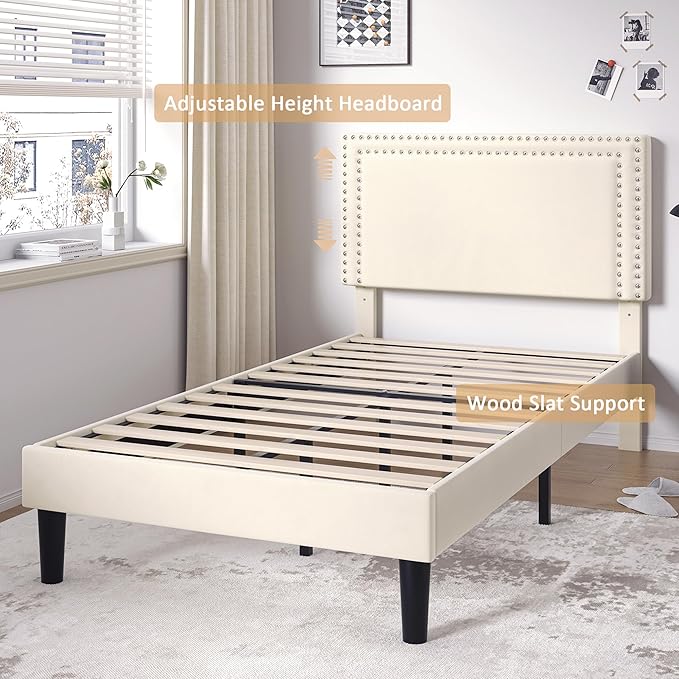 VECELO Twin Size Platform Bed Frame with Adjustable Upholstered Headboard, Strong Wood Slats Support, No Box Spring Needed, Easy Assembly