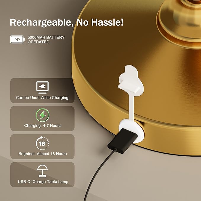 - 【BATTERY RECHARGEABLE LAMP】The DAWNWAKE Rechargeable Battery Operated Lamp is powered by a safe and durable 5000mAh lithium battery, eliminating the risk of tangled or exposed wires. It fully charges in just 4–7 hours and provides up to 10–18 hours of use. A 5V/1A USB-C charging cable is included. While charging, a red light appears on the touch control and turns blue when fully charged. This cordless table lamp is highly portable, easy to use, and perfect for any space.