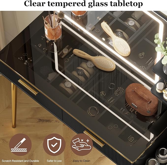 - 【Powerful Vanity Storage Space】-Are you still bothered by the fact that you have too many cosmetics and nowhere to put them? Try this makeup table with great storage function, containing 5 drawers, 3 open shelves, 2-layer hidden storage shelves with glass door, all your cosmetics and makeup tools can be sorted and stored neatly to the vanity table. Let you say goodbye to messy storage. It will be a great choice for you.