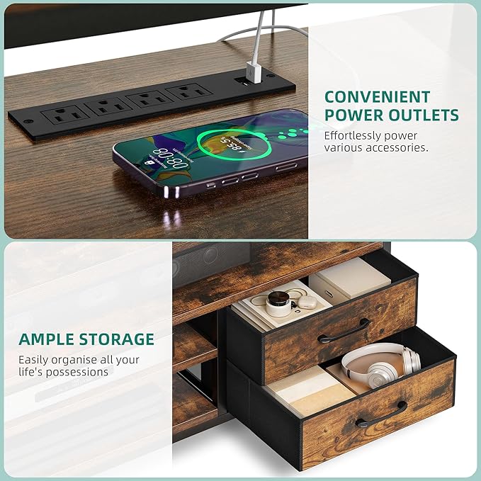 - Next-Level Entertainment Hub: Power your devices with 4 AC outlets and 2 USB ports on our rustic TV stand. The app or remote-controlled multi-color LED light strip enhances the ambiance, elevating your entertainment experience