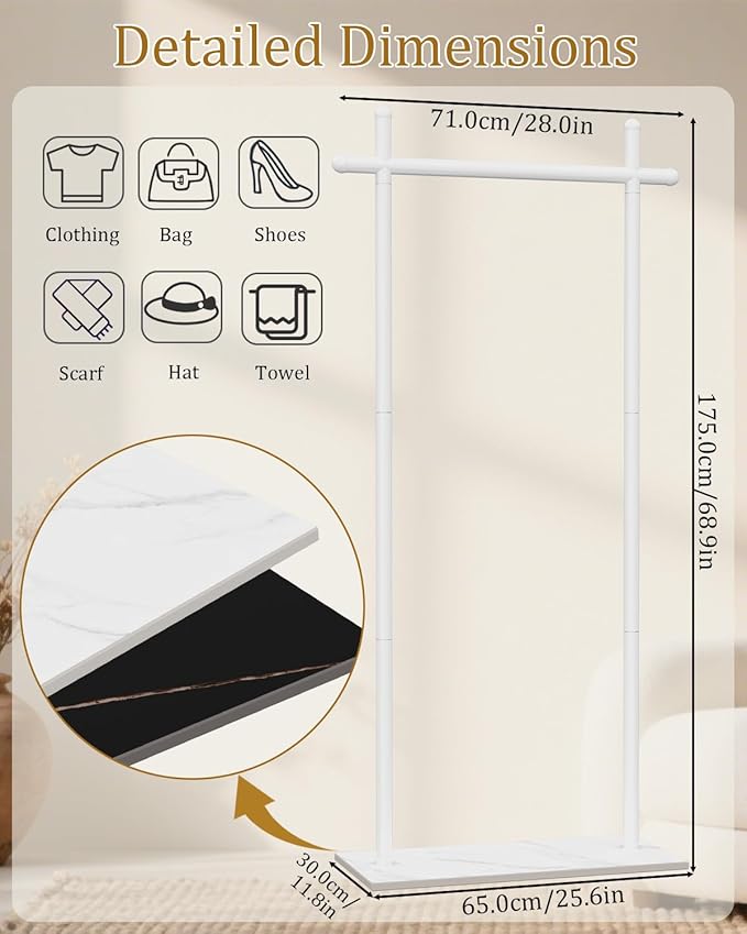 - High Quality Materials: We use high quality metal to keep the main body of the coat hanger freestanding upright and bear heavy clothes. We chose natural rock as the base to provide solid support, and surface is impermeable and easy to maintain