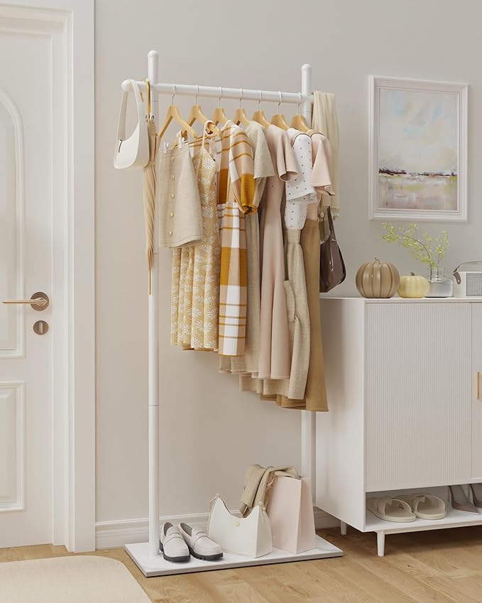 - Space Saving: The heavy duty clothes stand can hang your clothes, the bottom shelf provide space for your shoes and storage boxes, the 2 side hooks and 2 top hooks can hanging your bags and hats, making small space clean and organized