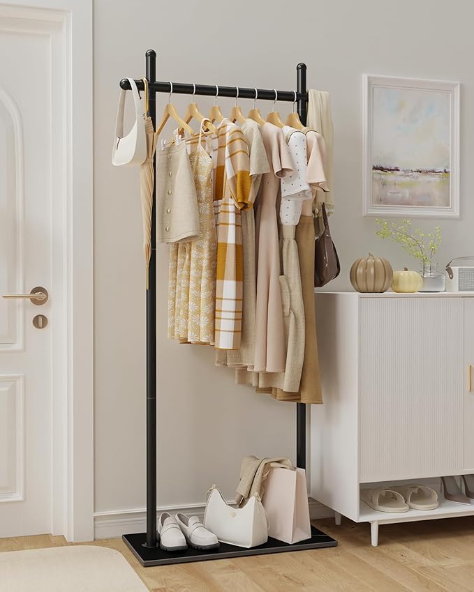 - Space Saving: The heavy duty clothes stand can hang your clothes, the bottom shelf provide space for your shoes and storage boxes, the 2 side hooks and 2 top hooks can hanging your bags and hats, making small space clean and organized