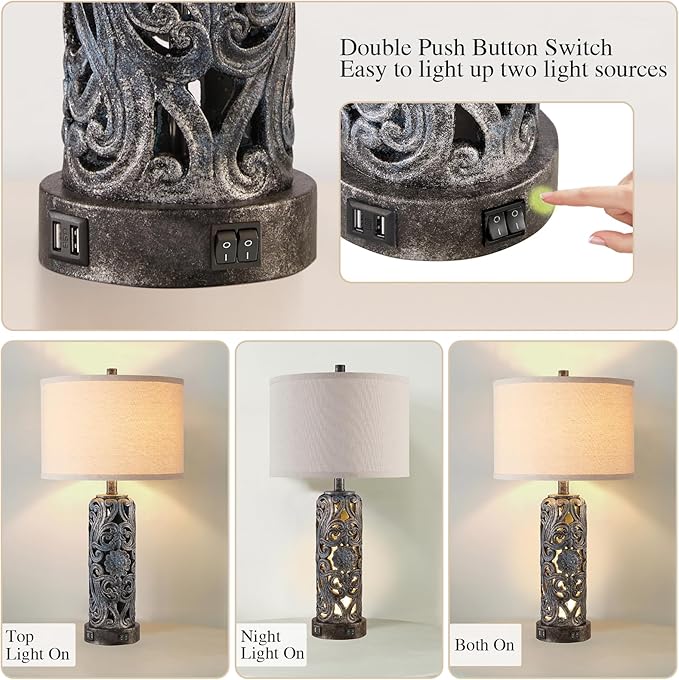 25'' Set of 2 Rustic Table Lamp for Bedroom Living Room with 2 USB Ports, Farmhouse Vintage Resin Nightstand Lamp with Nightlight, Antique Retro Desk Lamp for Entryway, 2 Bulbs Included