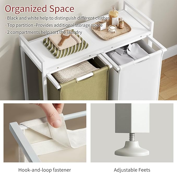 Laundry Hamper with Shelf, Laundry Basket 2 Section, Laundry Sorter with Pull-Out Removable Large 2 Color Bags and Movable, Metal Frame, 2 x 15.87 Gallons (60L), White PF06XLE