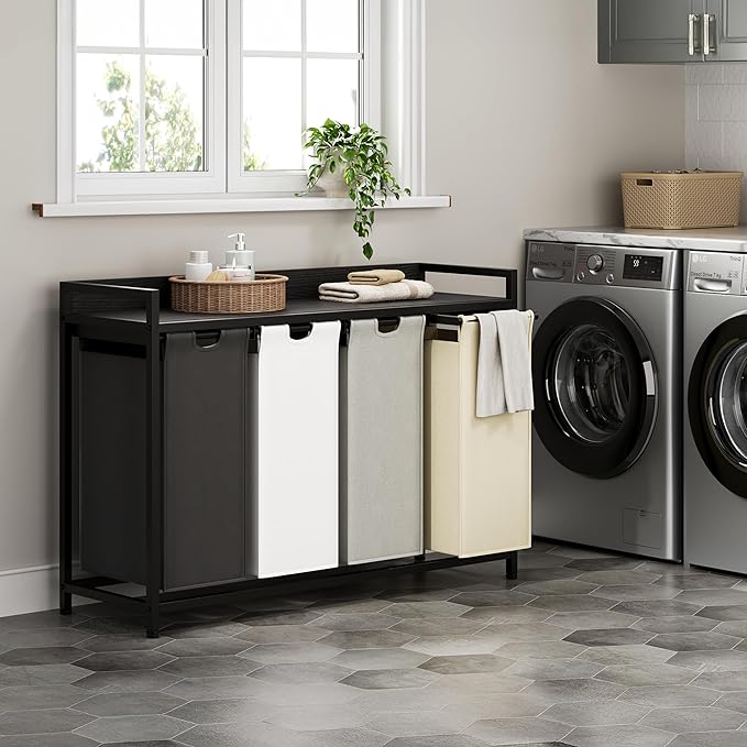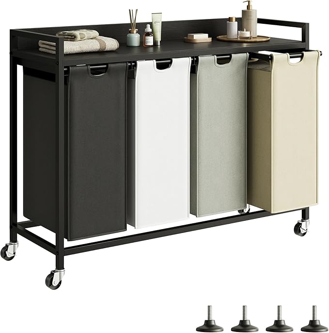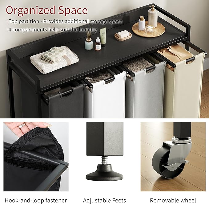 Laundry Hamper with Shelf, Laundry Basket 4 Section, Laundry Sorter with Pull-Out Removable Large 4 Color Bags and Movable Wheels, Metal Frame, 4 x 15.87 Gallons (60L), Black PF07XLK