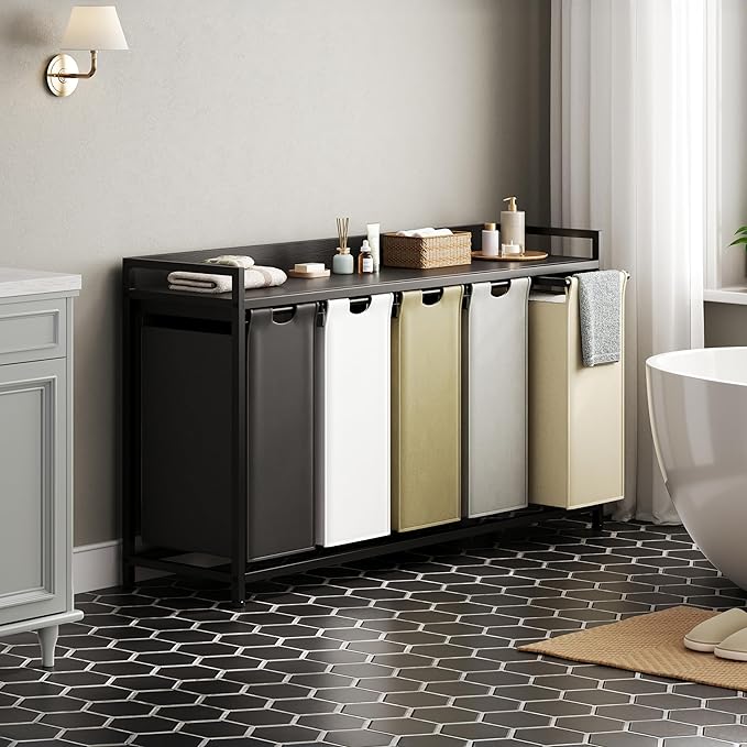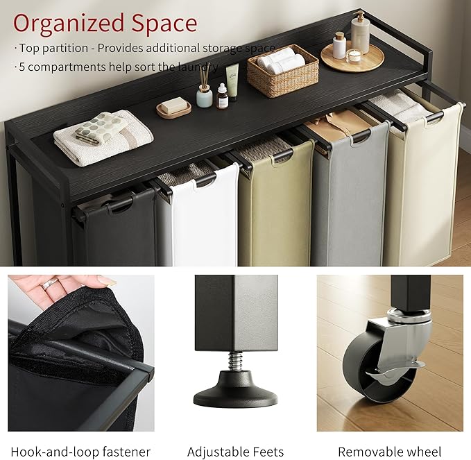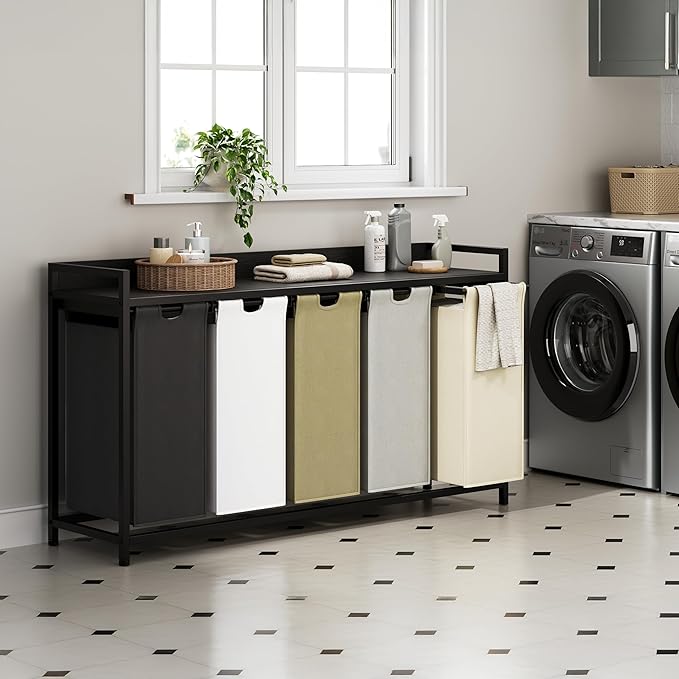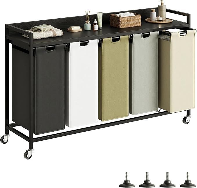 Laundry Hamper with Shelf, Laundry Basket 5 Section, Laundry Sorter with Pull-Out Removable Large 5 Color Bags and Movable Wheels, Metal Frame, 5 x 15.87 Gallons (60L), Black PF08XLK