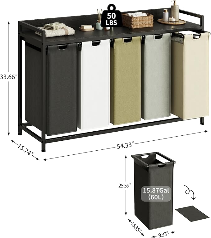 - Large capacity design - Overall dimensions: 54.33 L*15.74 W*33.66 H inches, individual bag dimensions: 9.33 L*15.35 W*25.59 H inches (15.87 gal/60L). This laundry basket features a four-color large capacity design, making it easy to distinguish and organize your clothes. Whether you want to separate clothes by different colors or separate underwear, jackets, and pants, it can meet your needs.