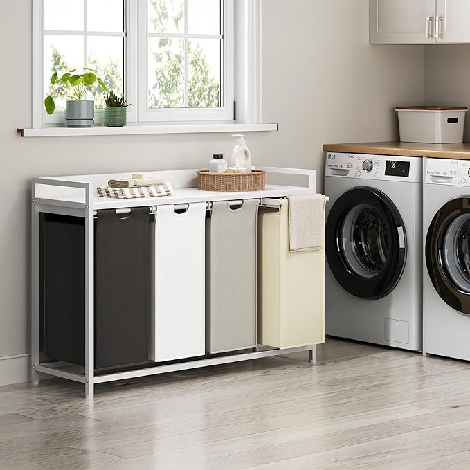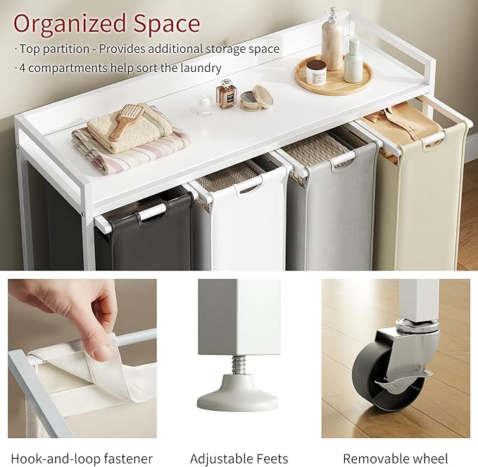 Laundry Hamper with Shelf, Laundry Basket 4 Section, Laundry Sorter with Pull-Out Removable Large 4 Color Bags and Movable Wheels, Metal Frame, 4 x 15.87 Gallons (60L), White PF07XLE