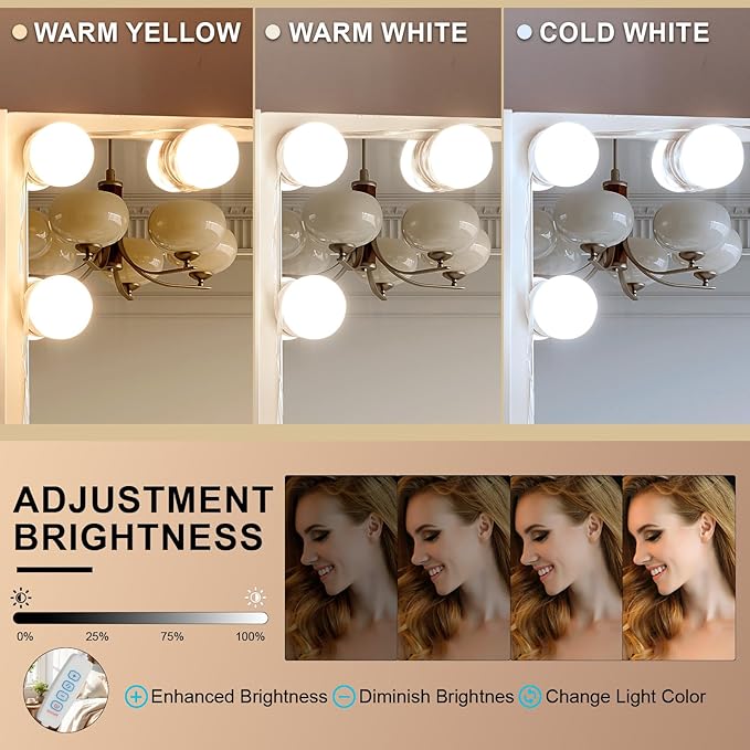 - 【 Vanity Desk with Mirror & 3 Lighting Modes】The lighted makeup vanity mirror features 3 adjustable light settings—3000K warm yellow, 4500K warm white and 6000K cool white—so you can apply makeup in any lighting condition. Whether for daytime or evening looks, this vanity desk with mirror and lights helps you achieve flawless results every time.