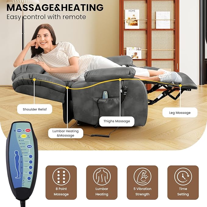 - 【Dual OKIN Motors for Lift Assistance】Equipped with two upgraded OKIN all-copper motors for smooth, independent control of the backrest and footrest. The lift function helps the elderly or those with mobility issues stand with ease. Includes two remotes—one for lift/recline, one for massage/heat.