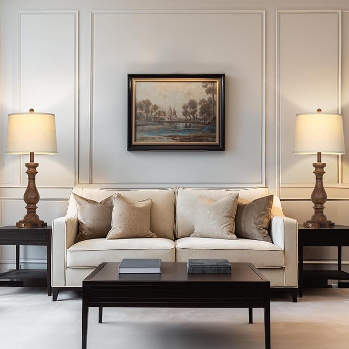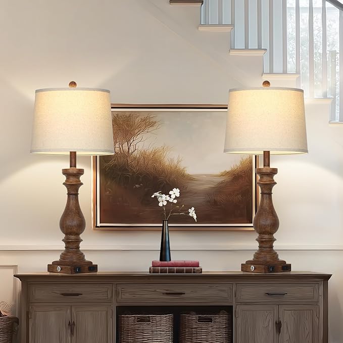 29" Tall Farmhouse Table Lamp for Living Room Set of 2,Vintage Retro Nightstand Lamps with USB C+A Ports & AC Outlet,3-Way Dimmable Touch Bedside Lamp for Bedroom Side Table,Brown
