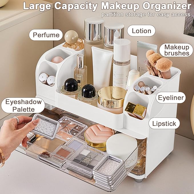 - 【Large Capacity】Size: 13.38in*7.08in*9.65in. This makeup organizer consists of 2 spacious drawers, 1 large open compartment and 6-slot brush holder, with extra large storage space for makeup brushes, eyeliners, facial masks, skin care products, perfumes and jewelry, etc. No need to worry about lack of storage space.
