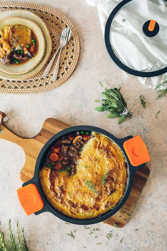 - MODERN & EASY TO CLEAN: A black finish with orange inserts gives this cookware a modern style. It is easy to clean and dishwasher safe.