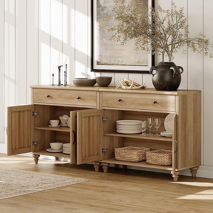 - 【Sturdy & Quality Assurance】Media console cabinet made from high-grade certified manufactured wood frame and thickened tabletop. Solid wood round gourd furniture legs add beauty and ensure the stability of the storage cabinet. Feel assured to place your TV on this high TV stand and enjoy your family time. Total Weight Capacity: 165 lbs