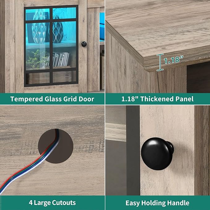 - Chic Farmhouse Design: Our farmhouse entertainment center blends glass side doors, robust particle boards, and a classic finish, seamlessly marrying tradition with modernity to add an elegant touch to your living space