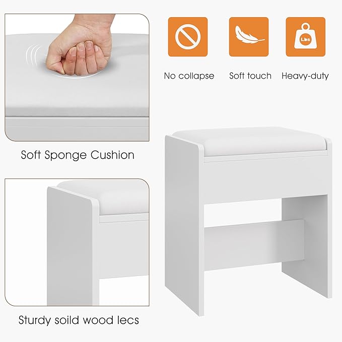 - 【Comfort and Safety】The white vanity table is made of high quality materials to ensure superior weight capacity and stability. The included stool is made of high-quality sponge and fabric, and the soft cushion can effectively reduce fatigue and provide a more comfortable makeup experience. Makeup Table comes with an anti-tip device, enhancing stability, preventing accidents and ensuring the safety of household members
