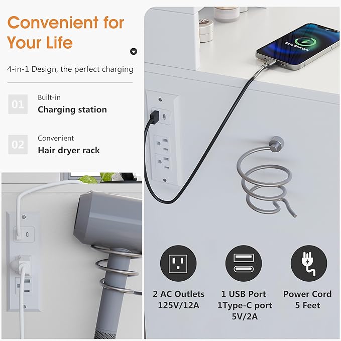 - 【Convenient Charging Station】The modern vanity table is equipped with an integrated charging station, featuring two AC outlets, one USB port, and one Type-C port. This design facilitates the convenient charging of various electronic devices, including mobile phones, hair dryers, and curling irons. Say goodbye to clutter, charge efficiently, and put smart life at your fingertips.