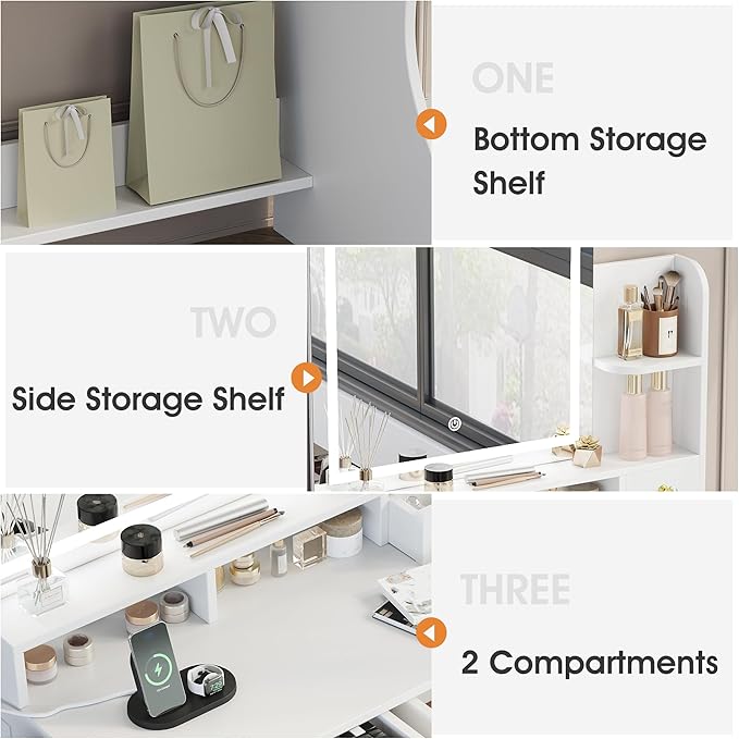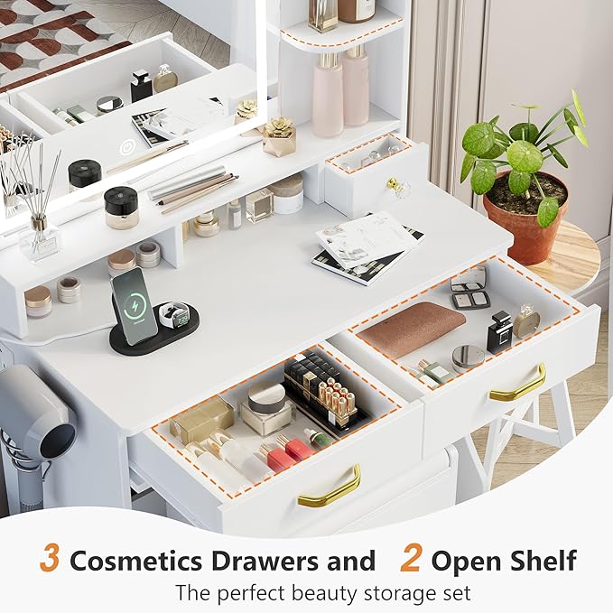 - 【Powerful Storage Capacity】The makeup vanity includes 2 deep drawers and 1 compact cosmetic drawer, 2 compartments and 3 open shelves - making cosmetics easily accessible. In addition, the hair dryer rack allows for safe storage of hair styling tools and keeps the worktop tidy.