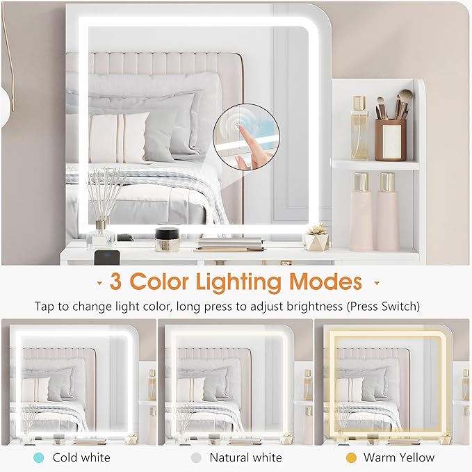 - 【Vanity Mirror with Lights】The mirror on the vanity desk is equipped with LED lights, which offer enhanced safety and a more aesthetically pleasing appearance compared to traditional bulbs. Three lighting modes are available: cold white, warm white and warm yellow. Touch switches allow color switching, while long press adjusts the brightness, allowing the perfect makeup look to be customized at any setting.