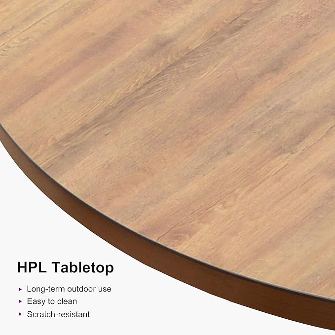 - Unique HPL Tabletop: Made from sustainable High Pressure Laminate material with a wood-grain design, free from any paint. Fade-proof and waterproof for long-term outdoor use.