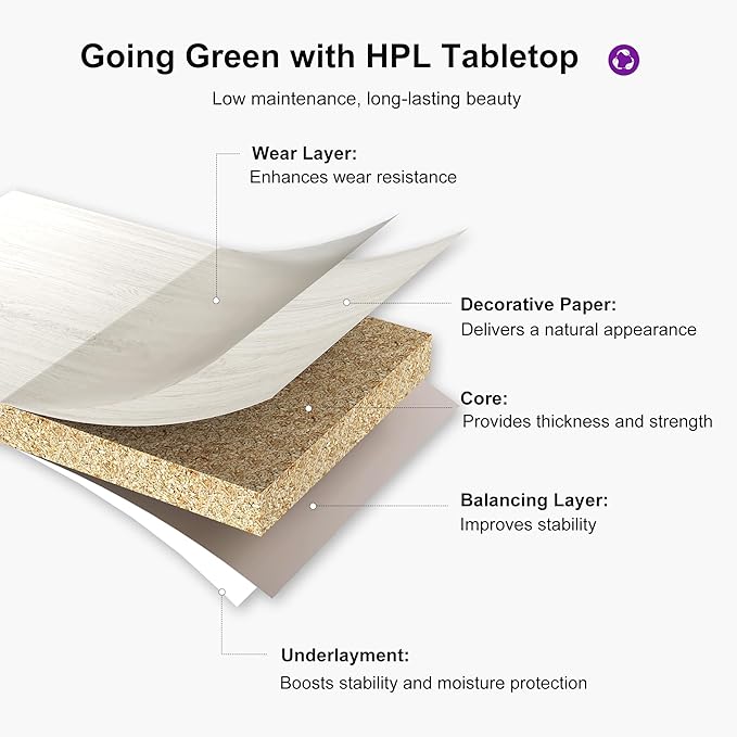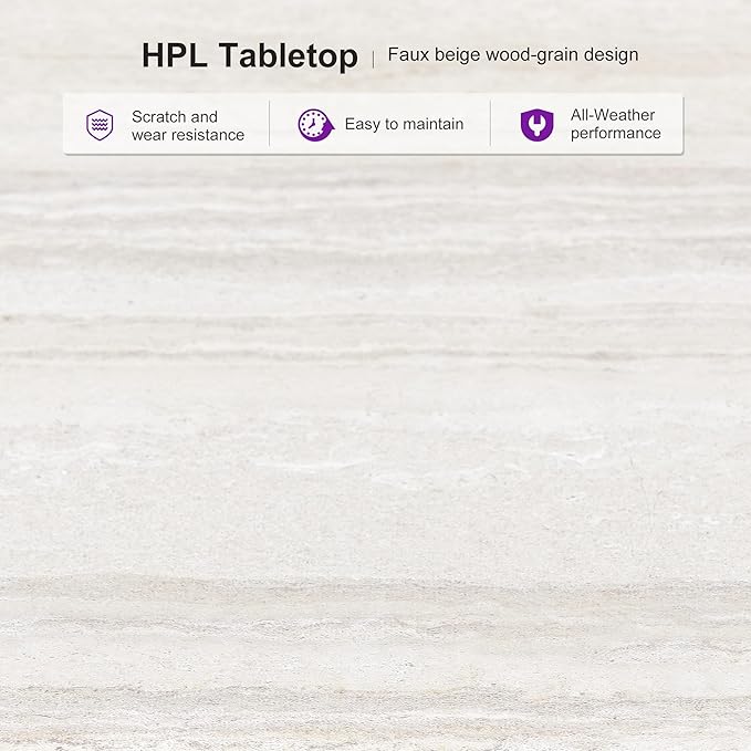 - Unique HPL Tabletop: Made from sustainable High Pressure Laminate material with a beige wood-grain design, free from any paint. Fade-proof and waterproof for long-term outdoor use.