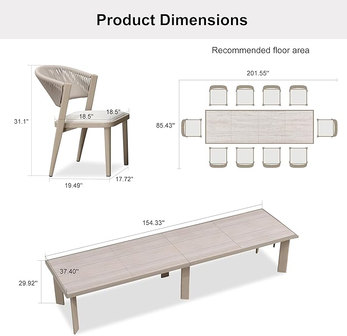 - Dining Set Dimensions: This outdoor dining set includes 12 dining chairs and 1 rectangle table. Table size: 154.33"L x 37.4"W x 29.92"H. Chair size: 19.69"D x 17.72"W x 31.1"H. Chair capacity: 300lbs.